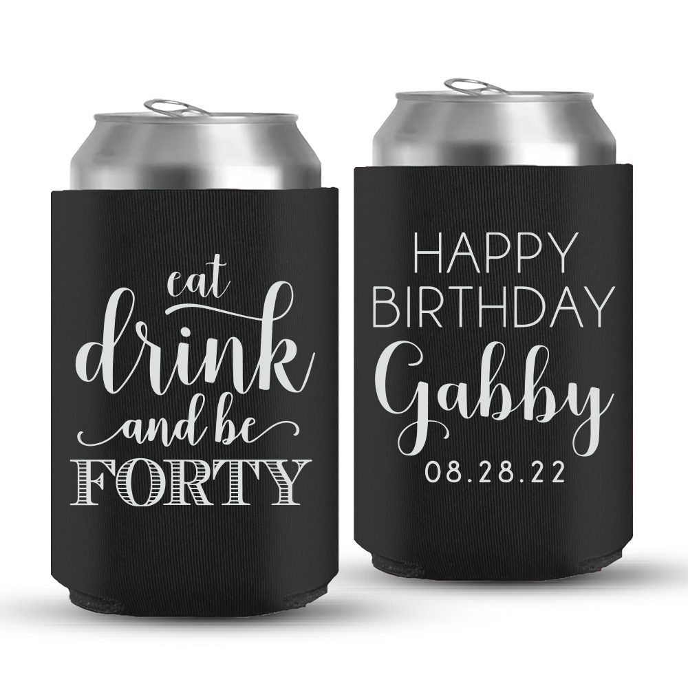 Make your 40th Birthday party memorable with our unique and affordable birthday koozies. Our birthday can coolers are available in multiple colors and are predesigned to fit 30 ml cans. These foam can coolers are insulated and are anti-slip and anti-fall in nature. This design says “ EAT DRINK AND BE FORTY”. The name and date can be personalized by you. You can use these cool birthday koozies to decorate your theme party and then impress your guests by gifting them to them.