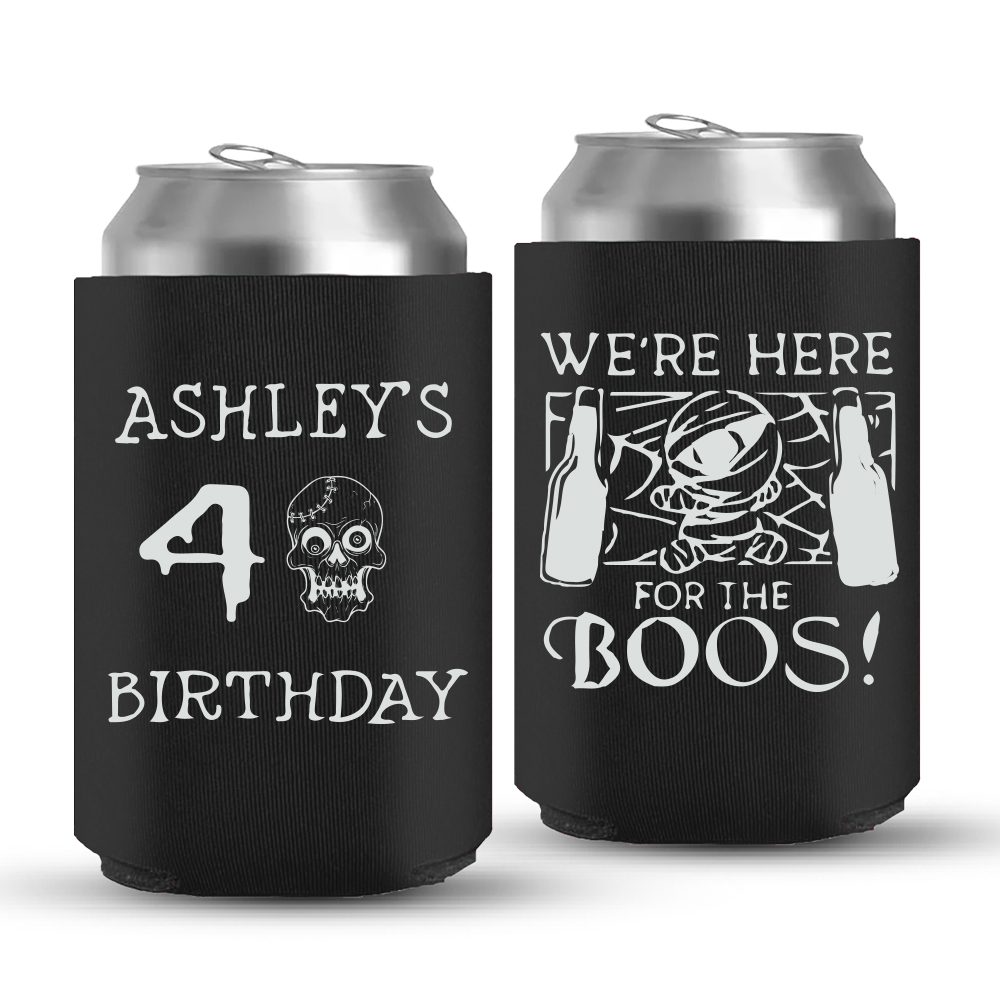 Get your hands on the most unique and fabulous collection of custom birthday can coolers to enhance your party decor. These birthday can coolers are an amazing pick for your 40th birthday party as they are available in collapsible designs. The can coolers are in foam material that keeps the booze cool for a long period to enjoy the party. It avoids condensation and the prices are affordable with high-discount & double-sided prints. Light up the mood of your guests with our durable & high-quality “We’re Here for the Boos!” & custom name birthday can coolers.