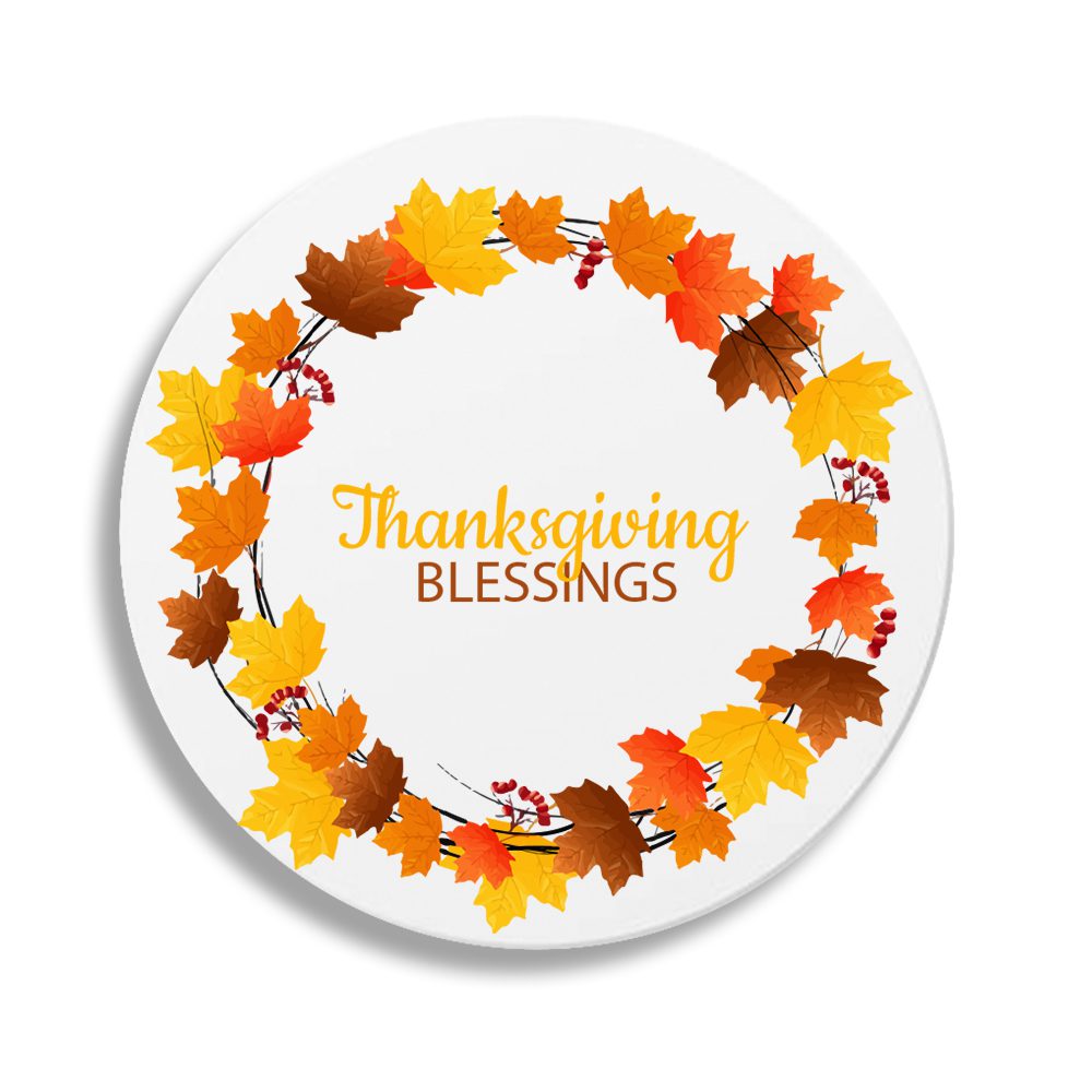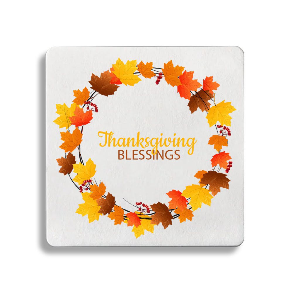 This beautiful Thanksgiving coaster is just what you need on your Thanksgiving dinner table. The artwork features a circle made of autumn leaves and Thanksgiving Blessings text in the middle. These custom drink coasters come in round or square shapes with artwork printed on one or both sides. You can surprise your guests at the dinner table or order these in bulk to gift your customers and employees.