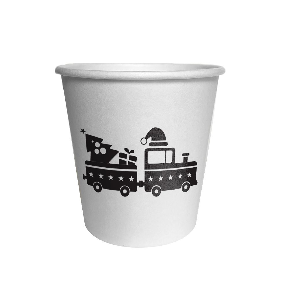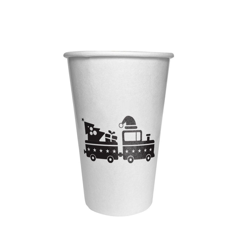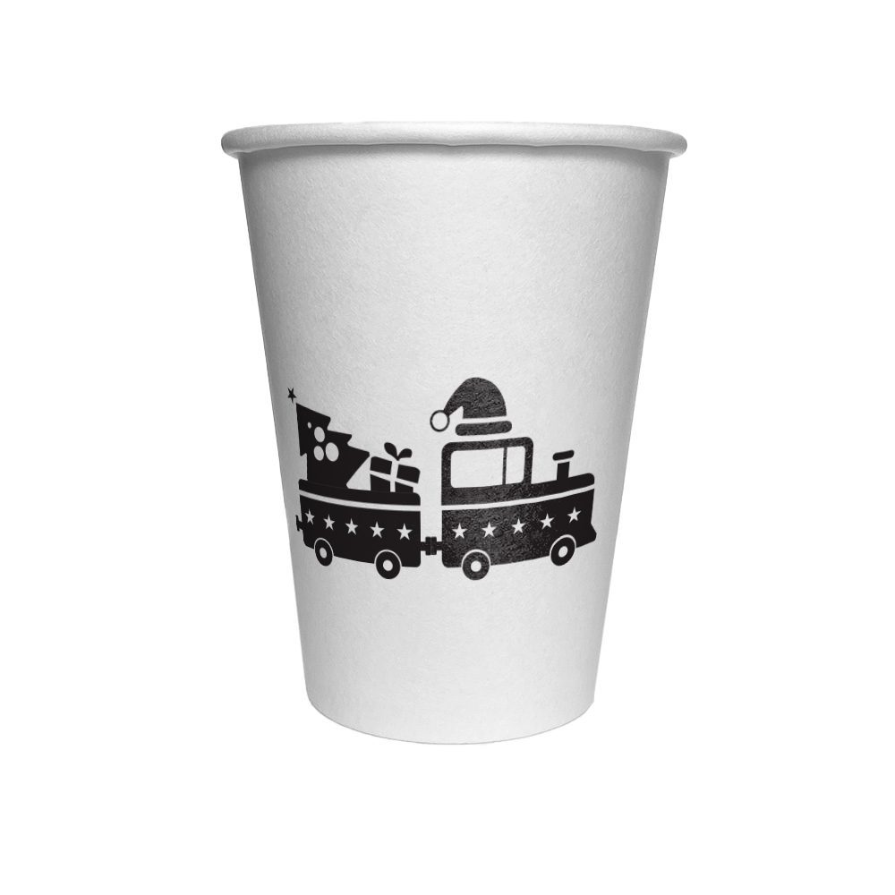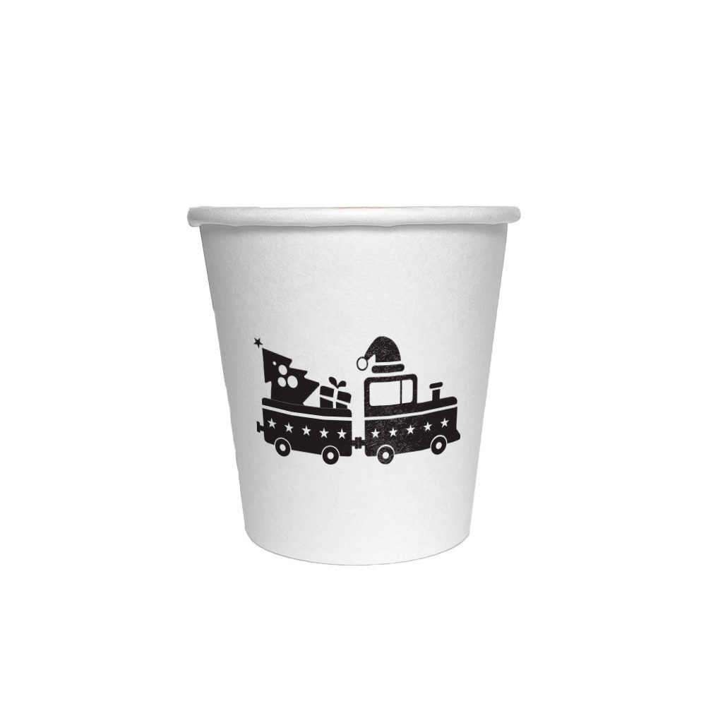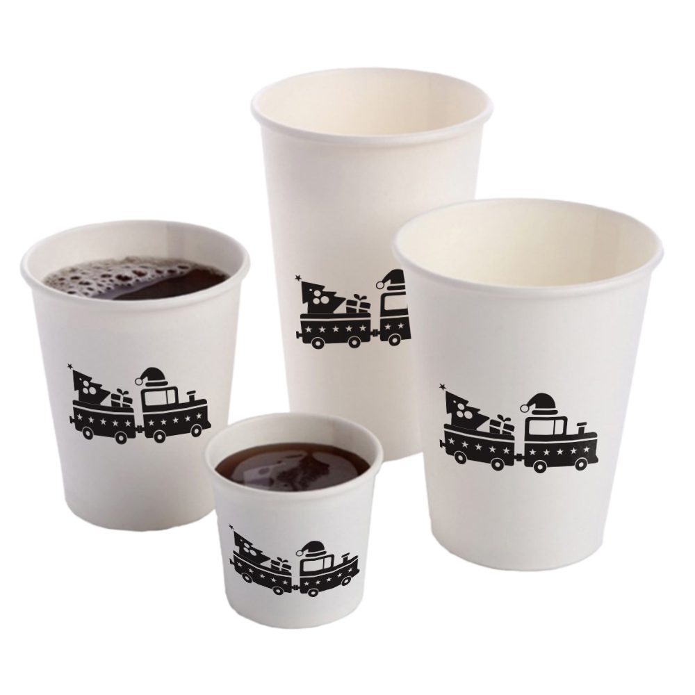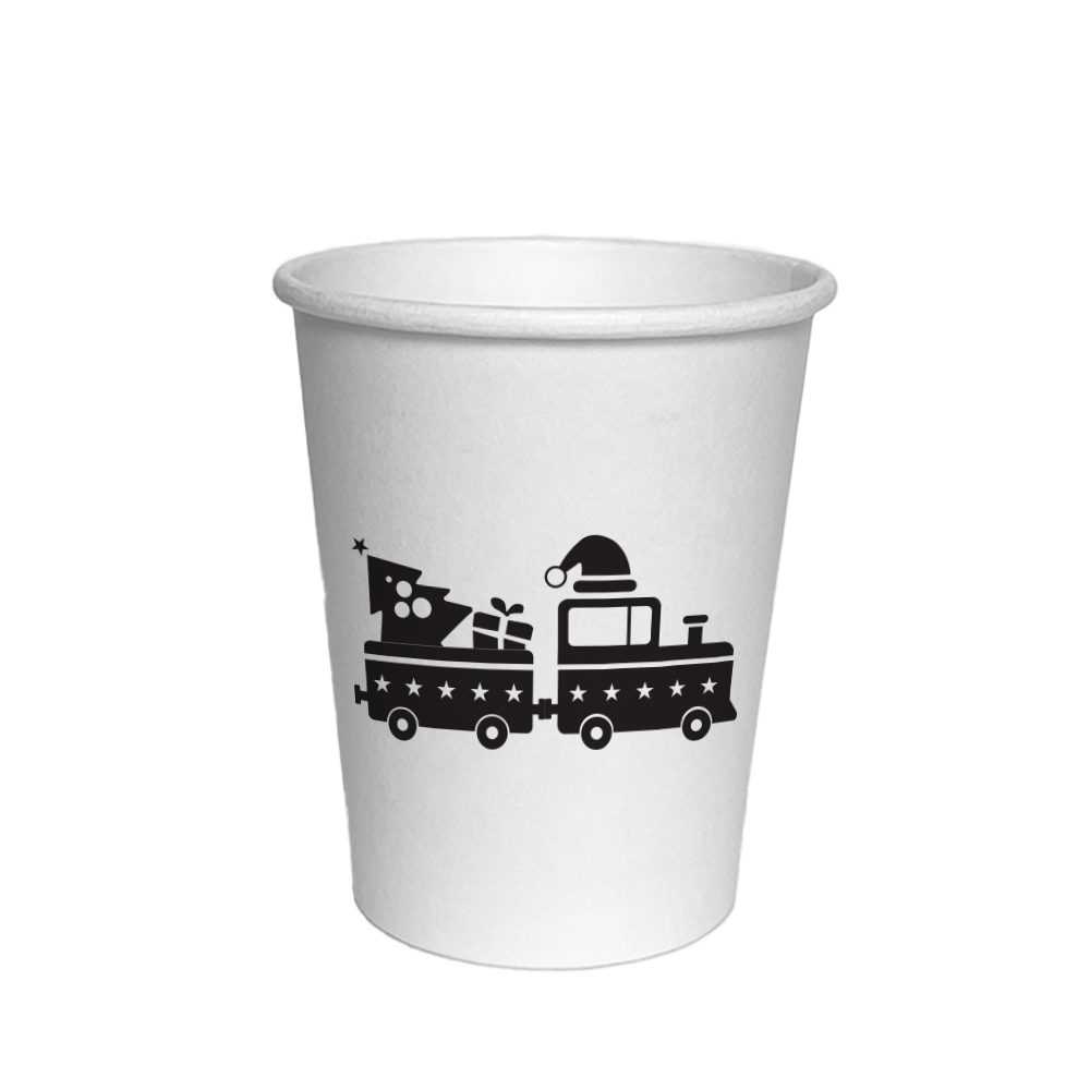 Add these beautiful Christmas cups to your party table and let people enjoy their favorite Xmas drinks. Featuring a shiny red truck with a Christmas tree, these custom cups are perfect for home or office holiday celebrations. Our all custom paper cups are priced at wholesale rates and the second side imprint is completely free. Don’t forget to check out our other pre-designed artwork for Christmas party cups.
