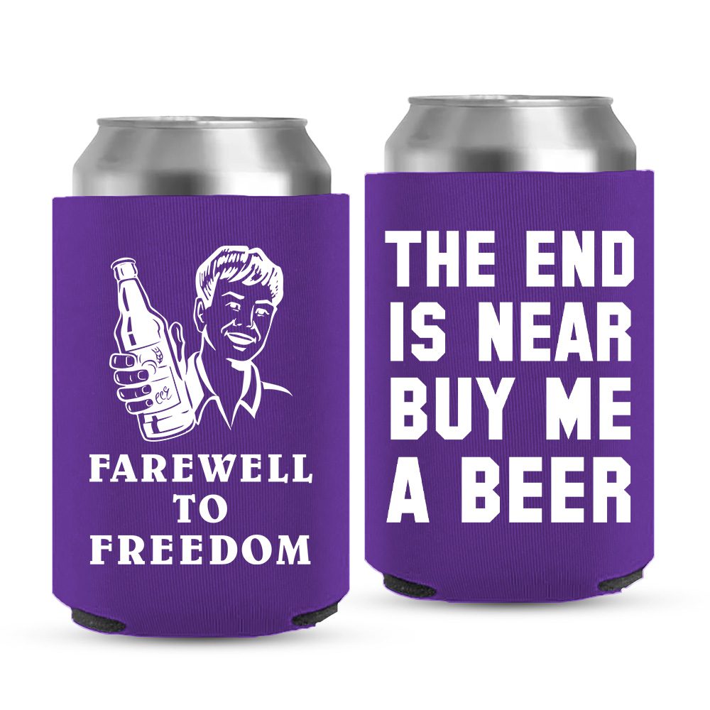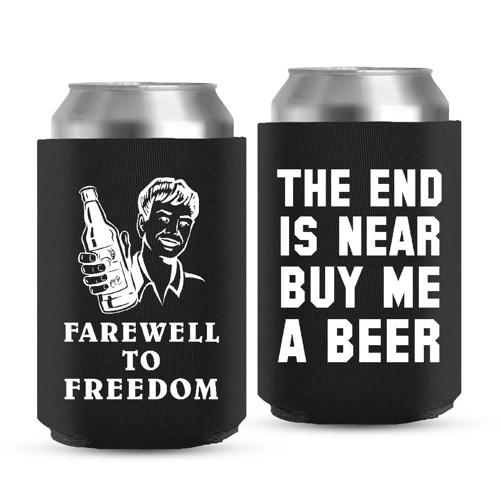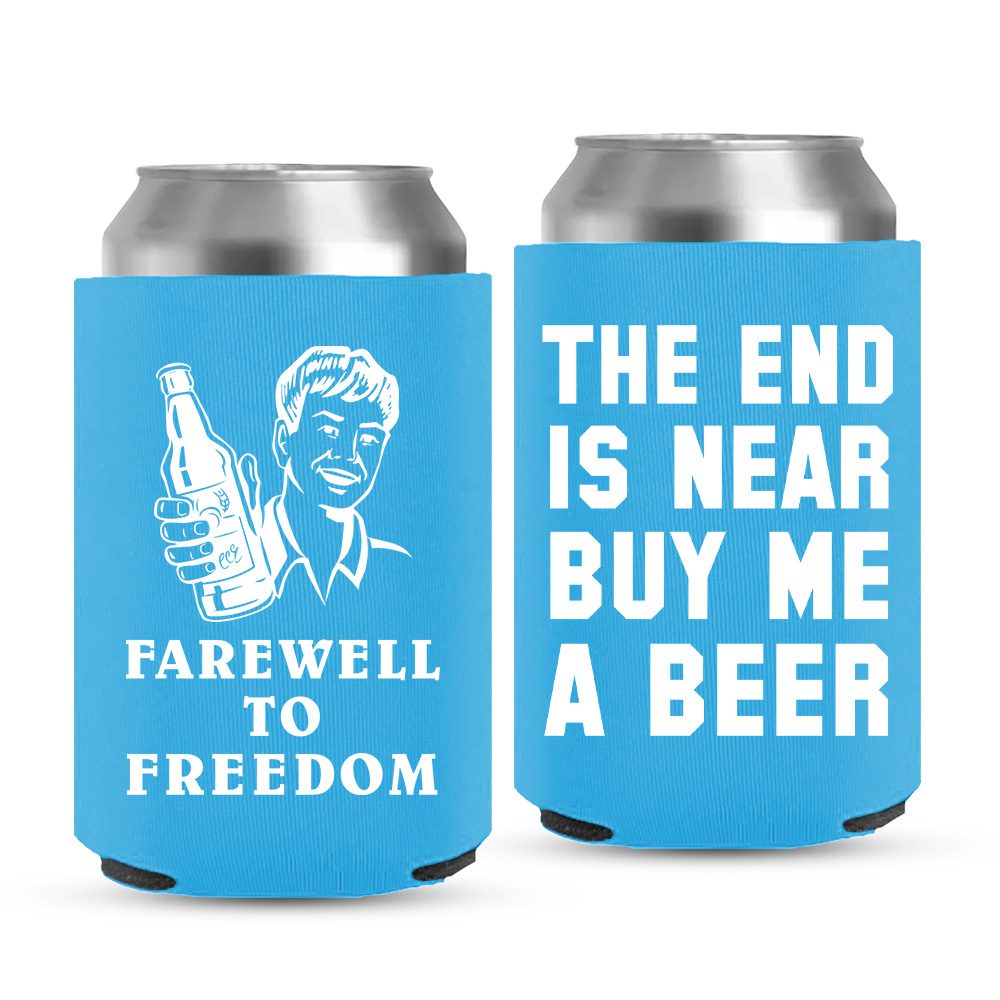 Farewell To Freedom!, quotes like these are best to remind grooms about their last day before being a married man. Buy this amazing can cooler made with our premium foam material. Choose from the beautiful colour options for this ready-made template. Want to check out more options? Check out our other offerings with attractive designs and humorous sayings. These coolers are best to enjoy 12 oz can and bottle beers to make the most of your last days as a bachelor.