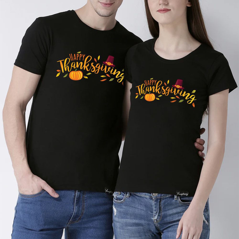 Add these classic and all-time popular t-shirts to your wardrobe this Thanksgiving. These are our pure cotton collection tees with a Happy Thanksgiving imprint. These are unisex and available in your favorite colors and sizes to make a memorable Thanksgiving party favor for your friends and family. Businesses can use these as corporate giveaways for employees & clients. The artwork is printable on both sides and we assure you the best value for the price for all holiday wearables.