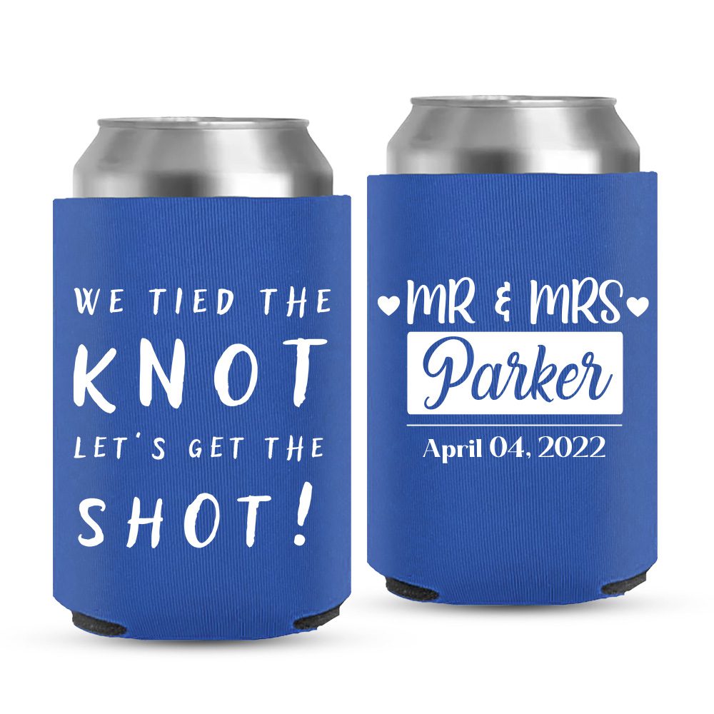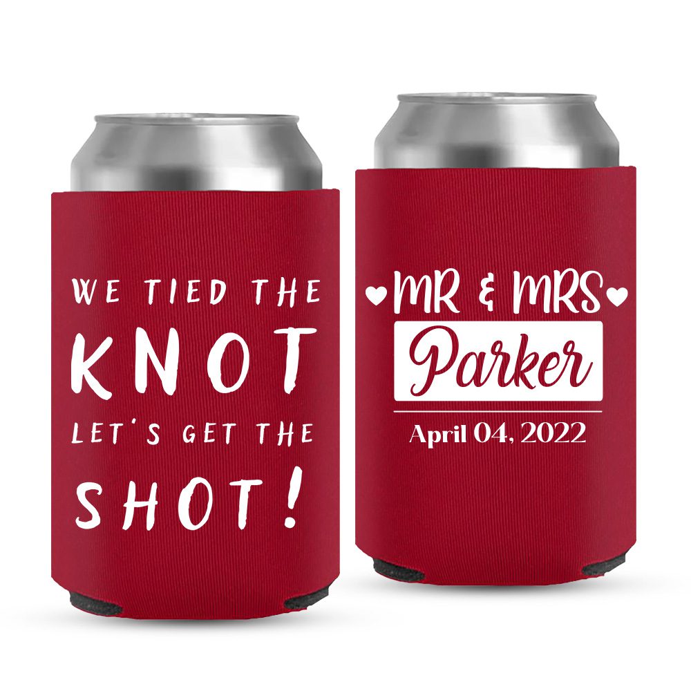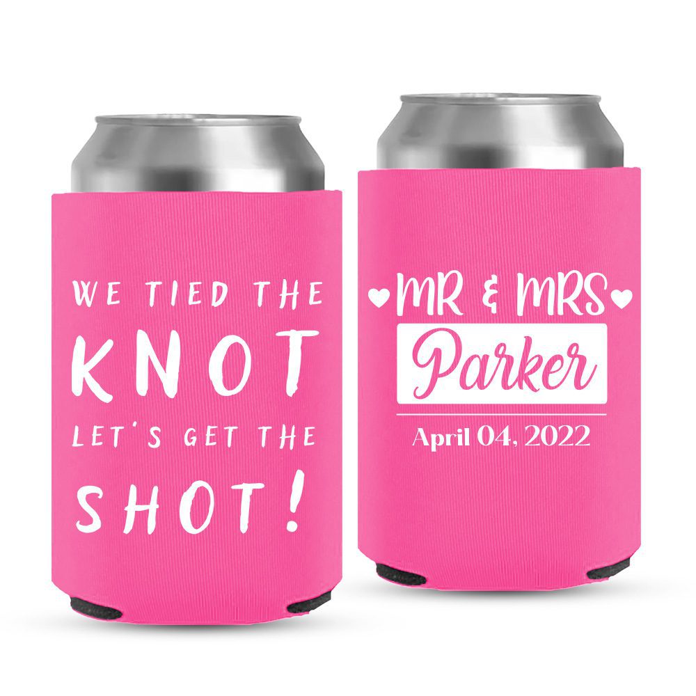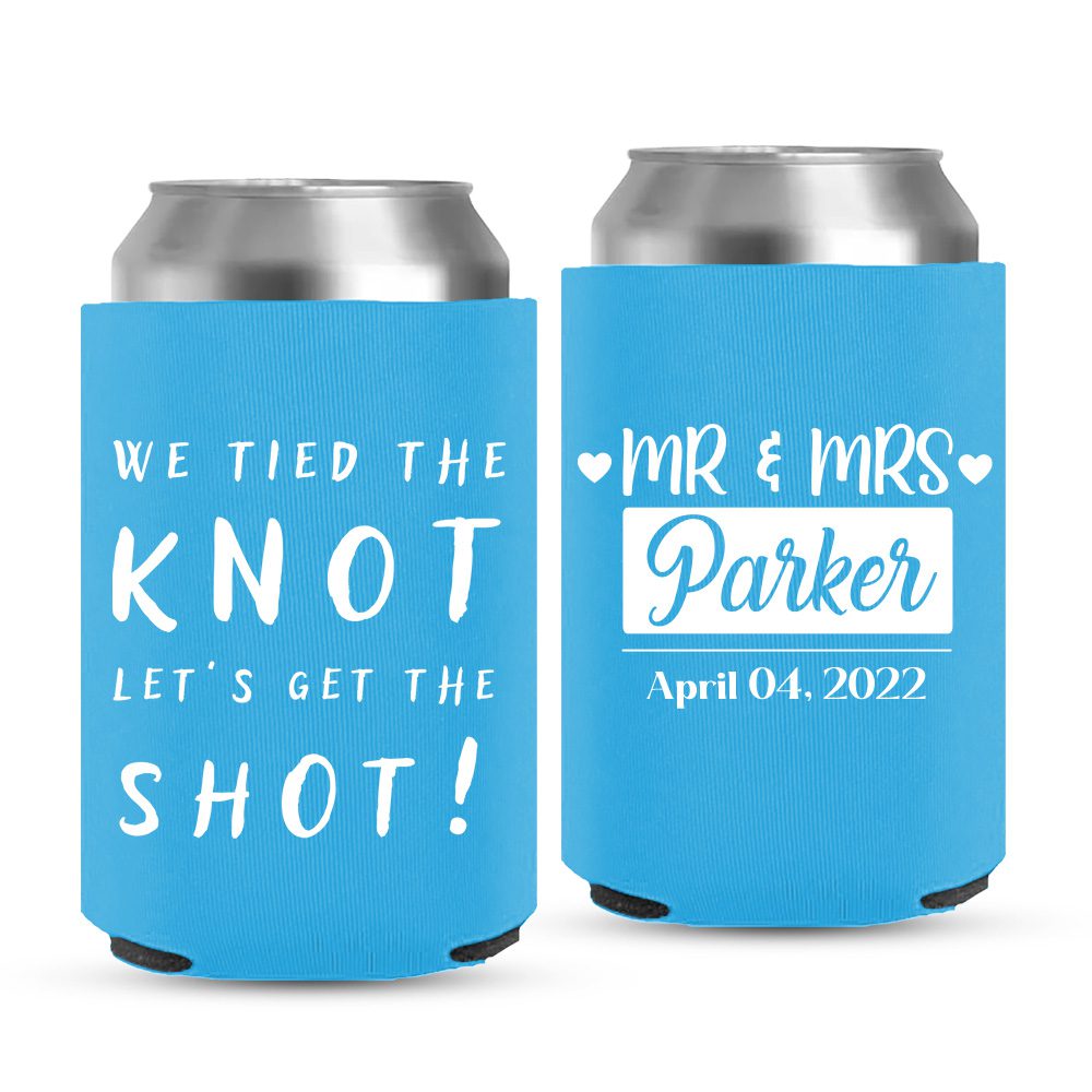 Show off this very cool “We tied the know let’s get a shot” wedding koozie to your friends and family. This double-sided koozie can also be customized with any other quote, you’d like. We have multiple color options to match any wedding theme. Get this highly insulated koozie that can keep your drinks cold and your hands dry and also collapse right into your pocket when not in use.
