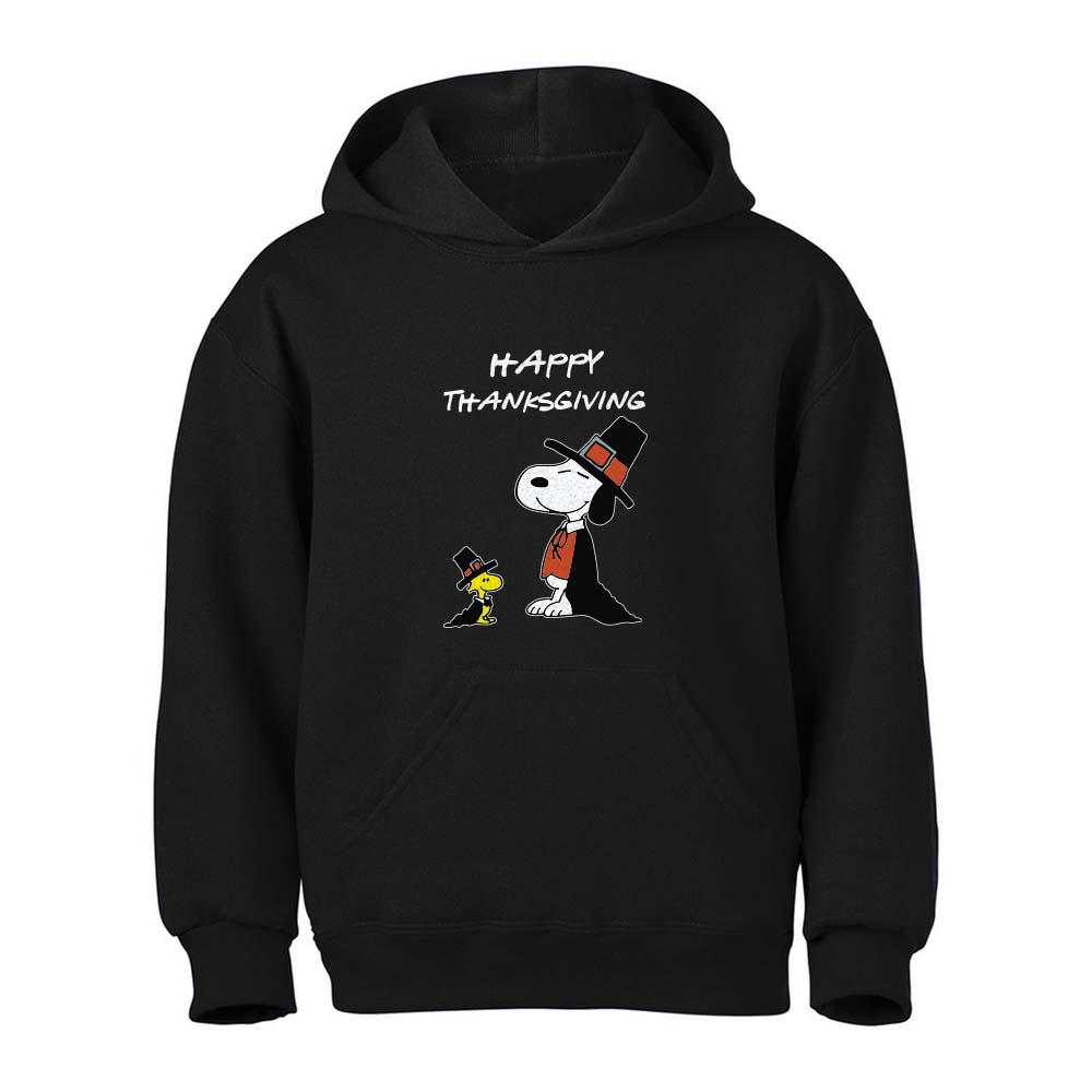 This is our popular Happy Thanksgiving hoodie featuring cartoon artwork. It’s an all-black hoodie and the artwork can be printed on the front, back, or both sides. Hoodies are ideal Thanksgiving gifts for all age groups and you’ll find all size options up to 3XL. All our Thanksgiving hoodies are made from a poly/cotton blend, making them breathable and light for both men and women.