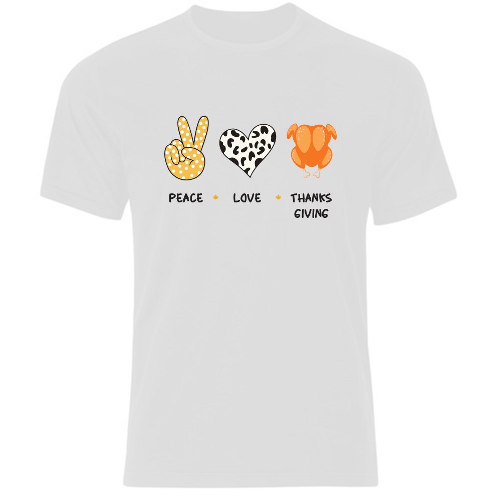 Fill your Thanksgiving party with warmth and harmony with these popular Thanksgiving t-shirt designs. Featuring a peace sign, heart, and turkey artwork at the center, these are 100% cotton to keep you comfortable all day. Surprise your friends and family or make an impactful corporate giveaway for your business with these beautiful tees. The artwork is customizable on both sides without breaking your budget.